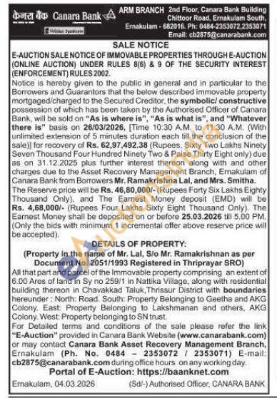 All that part and parcel of the Immovable property comprising an extent of 6.00 Ares of land in Sy no 259/1 in Nattika Village, along with residential building thereon in Chavakkad Taluk, Thrissur District with boundaries hereunder: North: Road, South: Property Belonging to Geetha and AKG Colony. East: Property Belonging to Lakshmanan and others, AKG Colony. West: Property belonging to SN trust