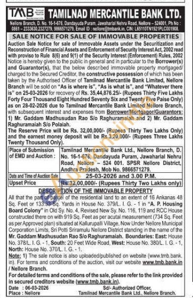 All that the part of parcel of the residential land to an extent of 16 Ankanas 48 Sq. Feet or 133.33 Sq. Yards in House No. 379/L 1. G. 1 in "A. P. Housing Board Colony in Old Sy. No. 4, Revised New Sy. No. 116, 119 and RCC House constructed there on with 919 Sq. Feet as per acutal measurement (734 Sq. Feet as per Approved plan) situated at Kallurupalli Village, Now Under Nellore Municipal Corporation Limits, Sri Potti Sriramulu Nellore District standing in the name of the Mr. Gaddam Madhusudan Rao Sio Raghuramaiah, Boundaries: East: House No. 378/L. I. G.-1, South: 20 Feet Wide Road, West: House No. 380/L. 1. G.-1, North: House No. 370/L. L. G.-1.