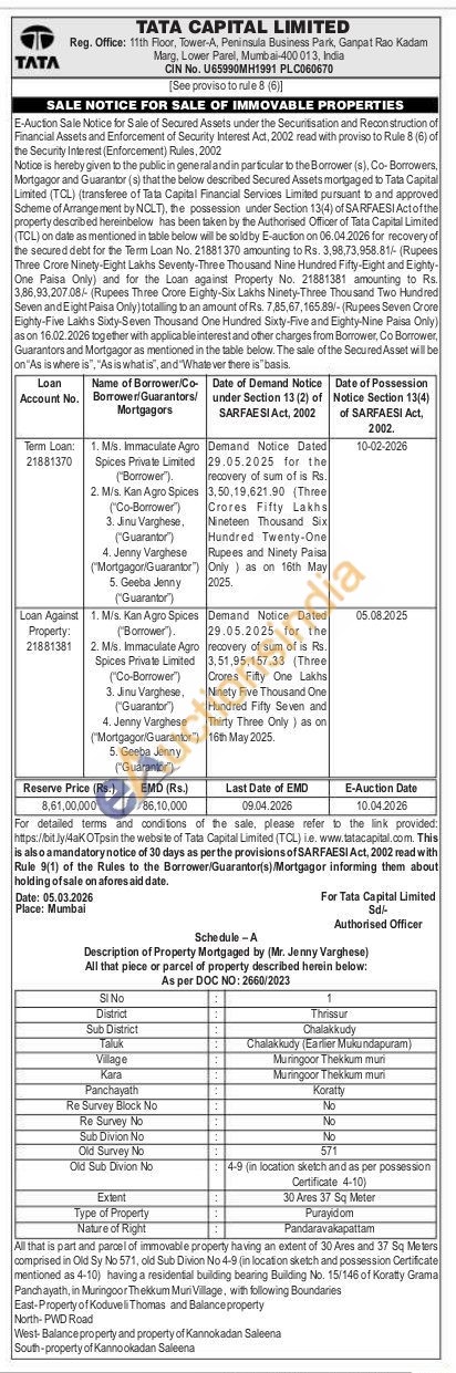 All that is part and parcel of immovable property having an extent of 30 Ares and 37 Sq Meters comprised in Old Sy No 571, old Sub Divion No 4-9 (in location sketch and possession Certificate mentioned as 4-10) having a residential building bearing Building No. 15/146 of Koratty Grama Panchayath, in Muringoor Thekkum Muri Village