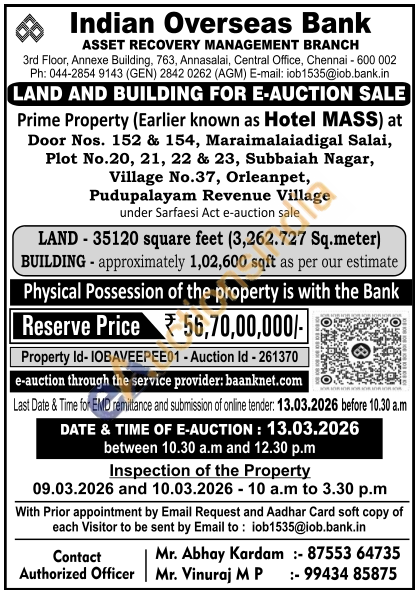 Prime Property (Earlier known as Hotel MASS) at Door Nos. 152 & 154, Maraimalaiadigal Salai, Plot No.20, 21, 22 & 23, Subbaiah Nagar, Village No.37, Orleanpet, Pudupalayam Revenue Village