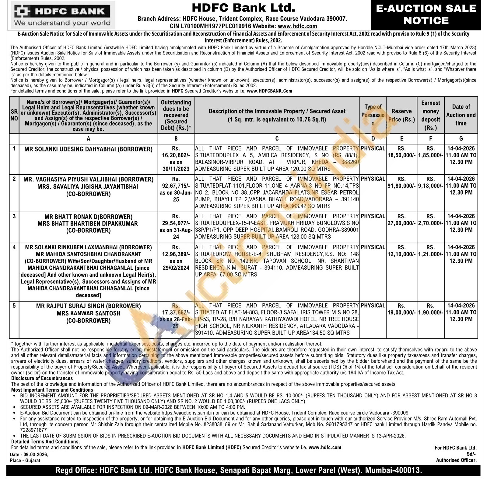 ALL THAT PIECE AND PARCEL OF IMMOVABLE PROPERTY F SITUATED AT FLAT-M-803, FLOOR-8 SAFAL IRIS TOWER M S NO 28, FP-53, TP-28, B/H NARAYAN KATHIYAWADI HOTEL, NR TREE HOUSE HIGH SCHOOL, NR NILKANTH RESIDENCY, ATLADARA VADODARA -391410. ADMEASURING SUPER BUILT UP AREA134.50 SQ MTRS