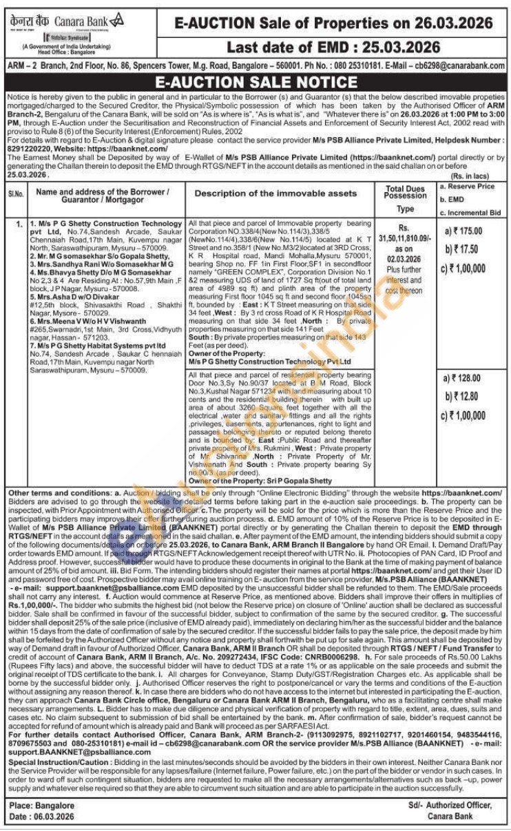 All that piece and parcel of residential property bearing Door No.3,Sy No.90/37 located at B M Road, Block No.3. Kushal Nagar 571234 with land measuring about 10 cents and the residential building therein with built up area of about 3260 Square feet together with all the electrical water and sanitary fittings and all the rights privileges, easements, appurtenances, right to light and passages belonging thereto or reputed belong therelo and is bounded by: East Public Road and thereafter private property of Mrs. Ruk Rukmirs, West: Private property of Mr. Shivanna North Private Property of Mr. Vishwanath And South Private property bearing Sy