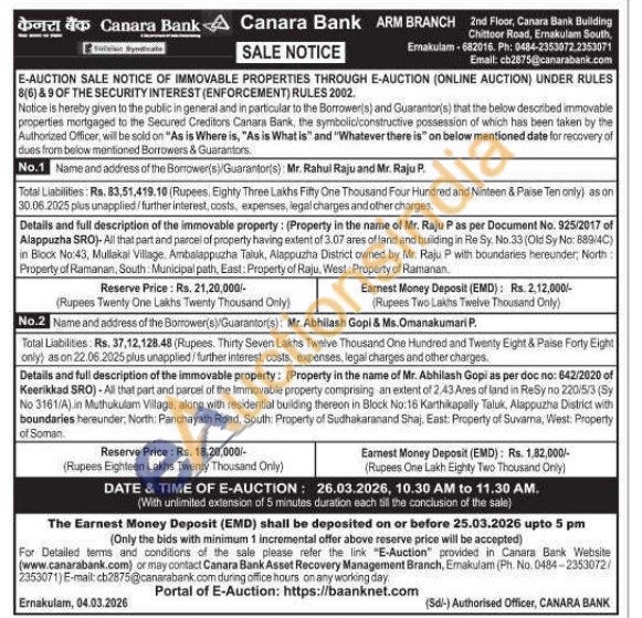 All that part and parcel of the limmovable property comprising an extent of 2.43 Ares of land in ReSy no 220/5/3 (Sy No 3161/A) in Muthukulam Village, along with residential building thereon in Block No:16 Karthikapally Taluk, Alappuzha District with boundaries hereunder: North Panchayath Road, South: Property of Sudhakaranand Shaj. East: Property of Suvama, West: Property of Soman
