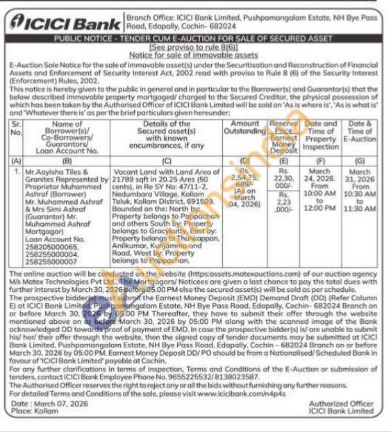 Vacant Land with Land Area of 21789 sqft in 20.25 Ares (50) cents), in Re SY No: 47/11-2 Nedumbara Village, Kollam Taluk, Kollam District, 691509. Bounded on the: North by: Property belongs to Pappachan and others South by: Property belongs to Gracykutty, East by: Property belongs to Thankappan, Anilkumar, Kunjamma and Road, West by: Property belongs to Pappachan