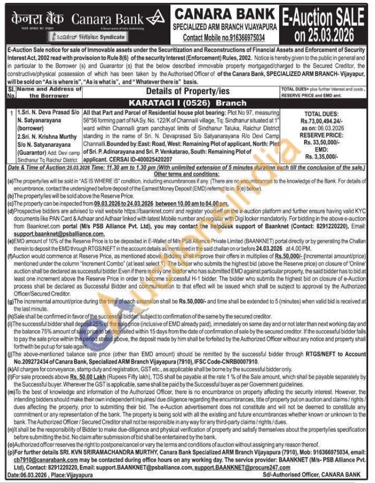 All that Part and Parcel of Residential house plot bearing: Plot No 97, measuring 56*56 forming part of NA Sy. No. 122/K of Channalli village, Tq: Sindhanur situated at 1" ward within Channalli gram panchayat limits of Sindhanur Taluka, Raichur District standing in the name of Sri. N. Devaprasad Sio Satyanarayana Rio Devi Camp Channalli. Bounded by: East: Road, West: Remaining Plot of applicant, North: Plot of Sri. P. Adinarayana and Sri. P. Venkatarao, South: Remaining Plot of applicant. CERSAI ID-400025420207