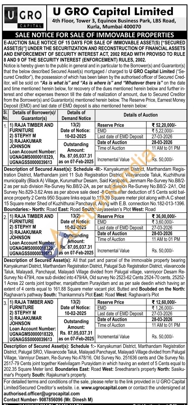 Description of Secured Asset(s): Schedule 1:- Kanyakumari District, Marthandam Registration District, Palugal SRO, Vilavancode Taluk, Malayadi Panchayat, Malayadi Village divided from Palugal Village, Vanniyur Desam, Re-Survey No.478/16, Old Survey No. 251636 cents and Ole Survey No. 2517-79 Cents joint together Keelvilagam Purayidam in which having an extent of 5 Cents equal to 202.35 Square Meter land. Boundaries East: Road West: Sreedharan's property North: Sasiku-mar's Property South: Rajakumar's property.