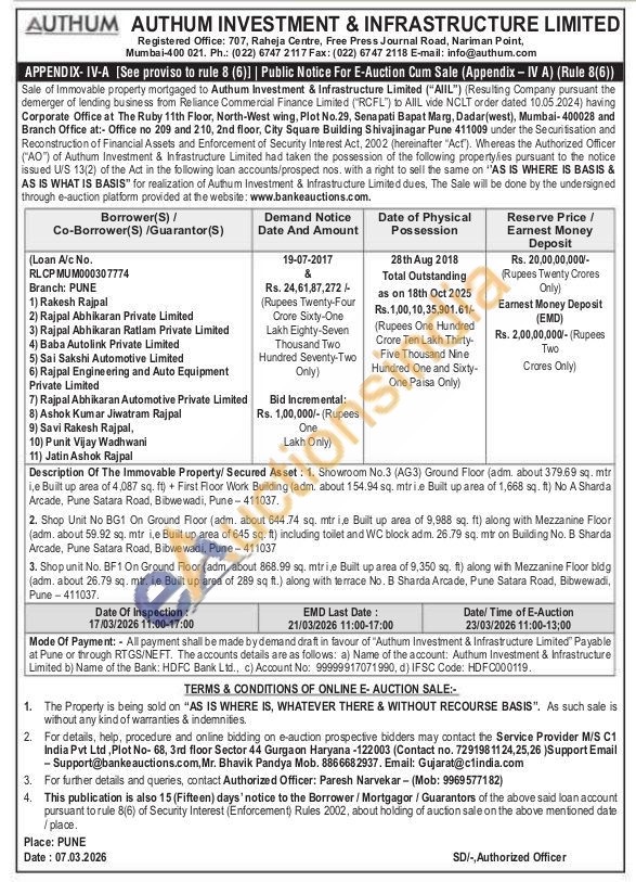 Description Of The Immovable Property/Secured Asset: 1. Showroom No.3 (AG3) Ground Floor (adm. about 379.69 sq. mtr i,e Built up area of 4,087 sq. ft) + First Floor Work Building (adm. about 154.94 sq. mírie Built up area of 1,668 sq. ft) No A Sharda Arcade, Pune Satara Road, Bibwewadi, Pune 411037. 2. Shop Unit No BG1 On Ground Floor (adm. about 644.74 sq. mtrije Built up area of 9,988 sq. ft) along with Mezzanine Floor (adm. about 59.92 sq. mtr i,e Built up area of 645 sq. ft) including toilet and WC block adm. 26.79 sq. mtr on Building No. B Sharda Arcade, Pune Satara Road, Bibwewadi, Pune 411037 3. Shop unit No. BF1 On Ground Floor (adm. about 868.99 sq. mtri,e Built up area of 9,350 sq. ft) along with Mezzanine Floor bldg (adm. about 26.79 sq. mtr. le Built up area of 289 sq ft.) along with terrace No. B Sharda Arcade, Pune Satara Road, Bibwewadi, Pune 411037.