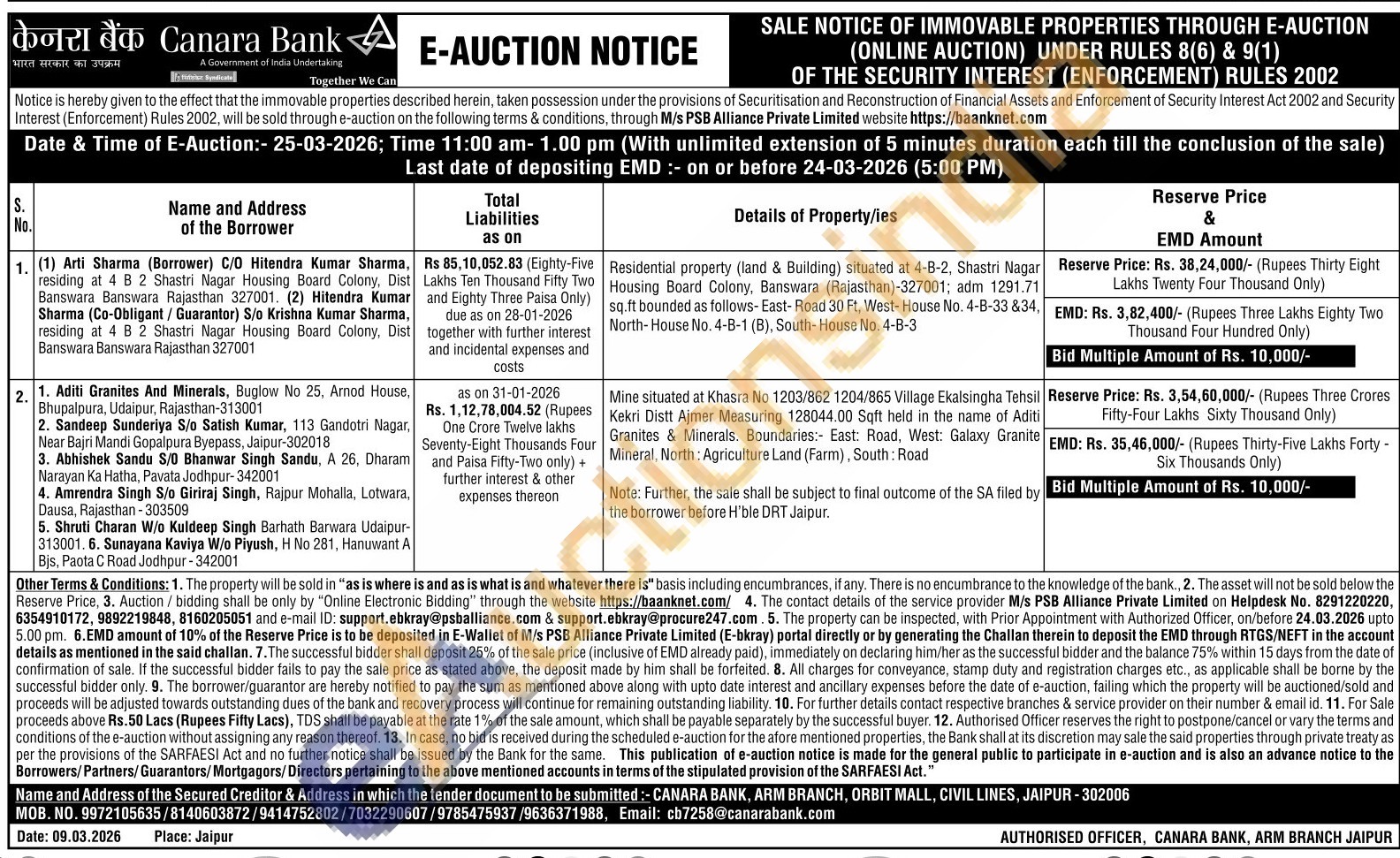 Residential property (land & Building) situated at 4-B-2, Shastri Nagar Housing Board Colony, Banswara (Rajasthan)-327001; adm 1291.71 sq.ft bounded as follows- East-Road 30 Ft, West-House No. 4-B-33 &34, North-House No. 4-B-1 (B), South-House No. 4-B-3