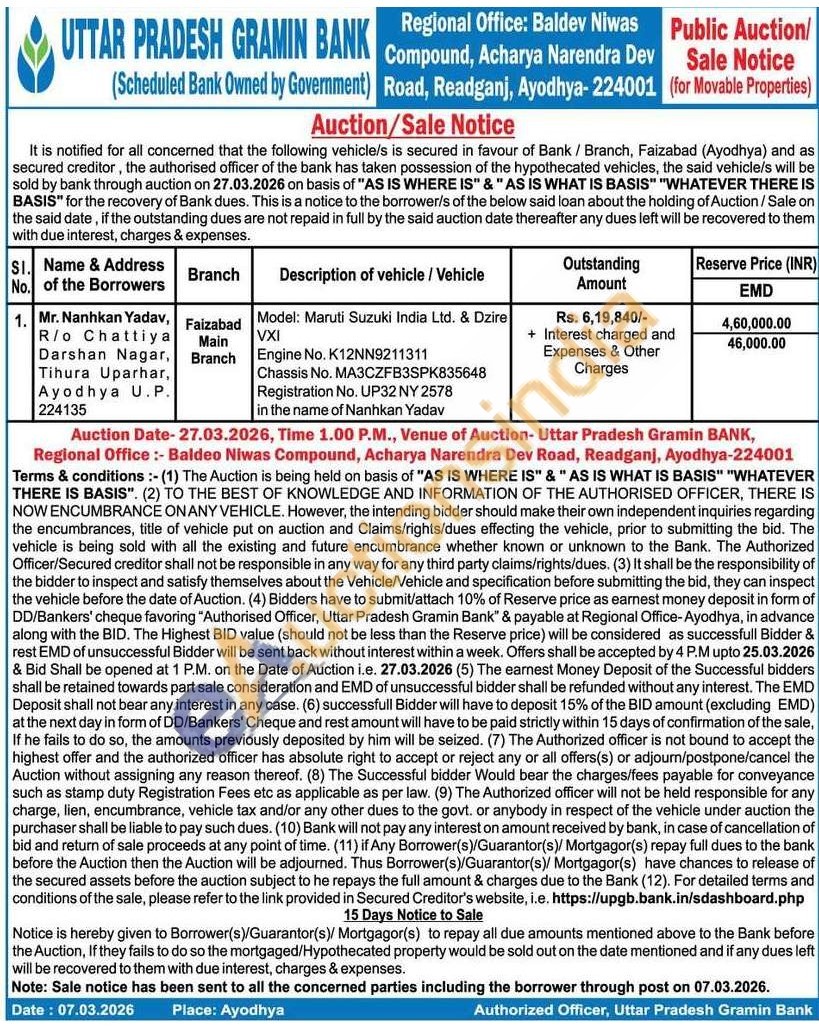 Model: Maruti Suzuki India Ltd. & Dzire VXI Engine No. K12NN9211311 Chassis No. MA3CZFB3SPK835648 Registration No. UP32 NY 2578 in the name of Nanhkan Yadav
