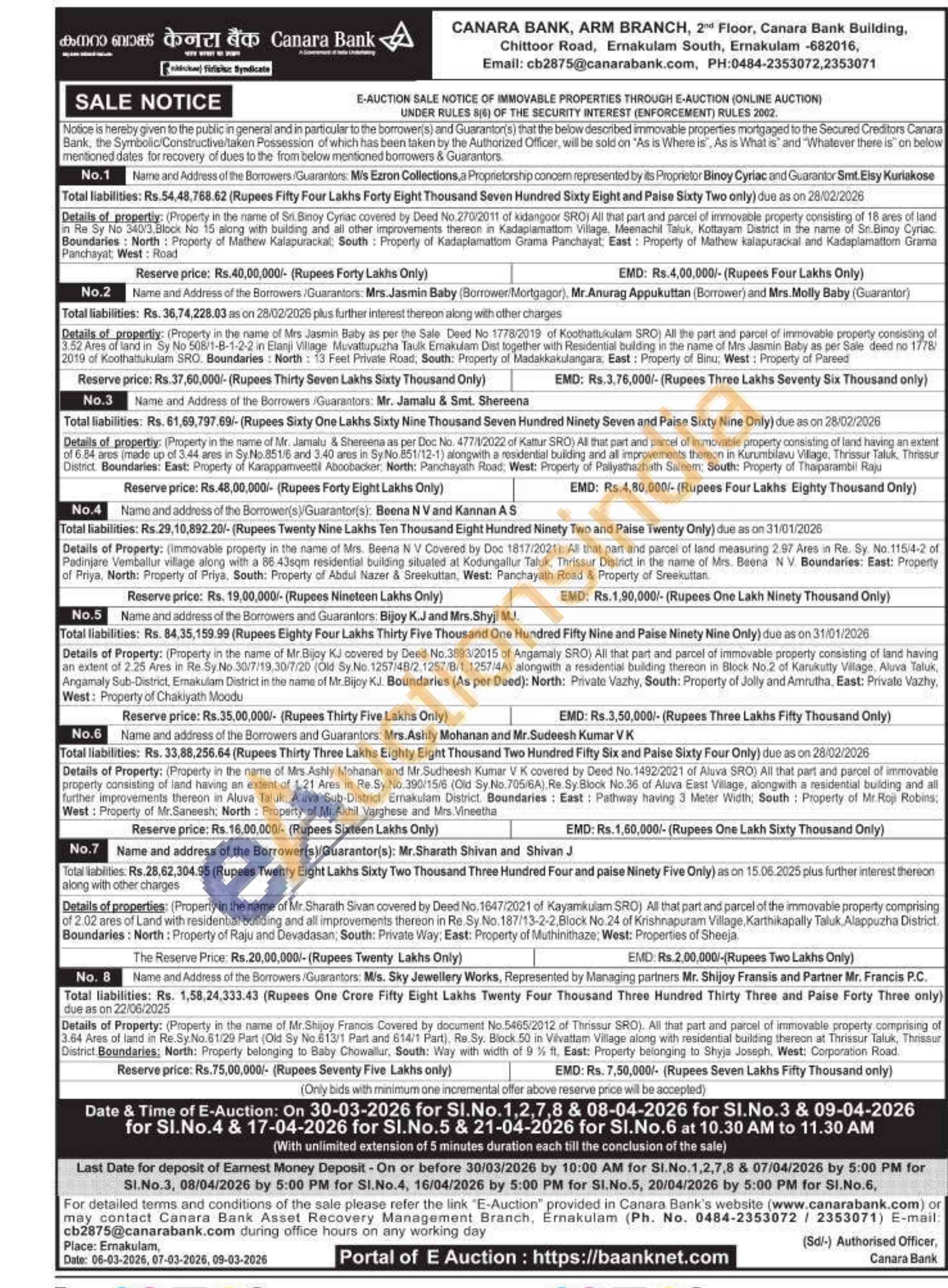 3) All that part and parcel of immovable property consisting of land having an extent of 6.84 ares (made up of 3.44 ares in Sy.No.851/6 and 3.40 ares in Sy. No.851/12-1) alongwith a residential buliding and all improvements thereon in Kurumbilavu Village, Thrissur Taluk, Thrissur District. Boundaries: East: Property of Karappamveettil Aboobacker, North: Panchayath Road, West: Property of Pallyathazhath Saleem: South: Property of Thaiparambil Raju