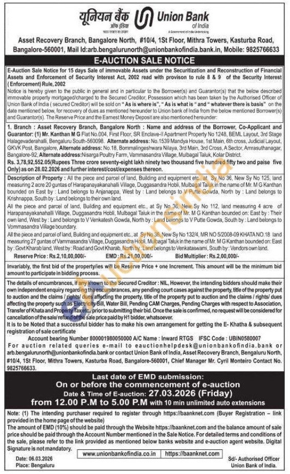 Description of Property: All the piece and parcel of land, Building and equipment etc., at. Sy No 36, New Sy No 125, land measuring 2 acre 20 guntas of Harapanayakanahalli Village, Duggasandra Hobli, Mulbagal Taluk in the name of Mr. M G Kanthan bounded on East by Land belongs to Anjanappa, West by Land belongs to V Putte Gowda, North by Land belongs to Krishnappa, South by: Land belongs to their own land. All the piece and parcel of land, Building and equipment etc., at Sy No 36, New Sy No 112, land measuring 4 acre of Harapanayakanahalli Village, Duggasandra Hobli, Mulbagal Taluk in the name of Mr. M G Kanthan bounded on: East by: Their own land, West by: Land belongs to V Venkatesh Gowda, North by: Land belongs to V Putte Gowda, South by Land belongs to Vommasandra Village boundary All the piece and parcel of land, Building and equipment etc., at Sy No 36, New Sy No 132/4, MR NO 5/2008-09 KHATA NO.18 land measuring 27 guntas of Vammasandra Vilage, Duggasandra Hobli, Mulbagal Taluk in the name of Mr. MG Kanthan bounded on: East by: Govt Kharab land, West by: Road and Govt Kharab, North by: Land belongs to Venkataswami, South by: Vendors own land
