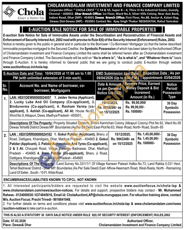 Descriptions Of The Property: Land Survey No.33/1/1/1 Of Village Kanwan Patwari Halka No.73, Land Rakba 0.031 Hect. Tehsil Badnavar District - Dhar MP. Boundaries (As Per Sale Deed) East -Mhow-Neemach Road, West-Rasta, North - Remaining Land Of Seller, South-15 Ft. Wide Road.