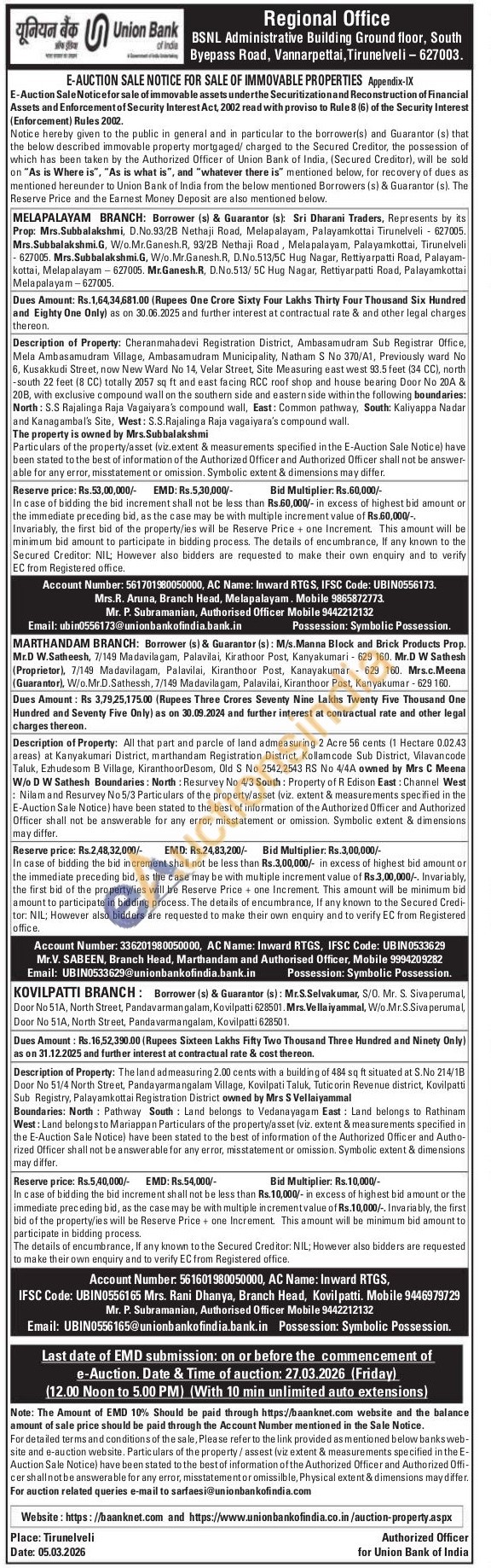 Mrs.R. Aruna, Branch Head, Melapalayam. Mobile No : 9865872773 / Mr. P. Subramanian, Authorised Officer Mobile No : 9442212132