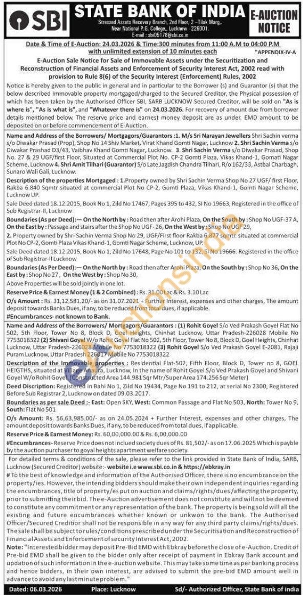 Property owned by Shri Sachin Verma Shop No 29, UGF/First floor Rakba 6.877 sqmtr. situated at commercial Plot No CP-2, Gomti Plaza Vikas Khand-1, Gomti Nagar Scheme, Lucknow, UP. Sale Deed dated 18.12.2015, Book No 1, Zild No 17648, Page No 101 to 132, SI No 19666. Registered in the office of Sub Registrar-II Lucknow