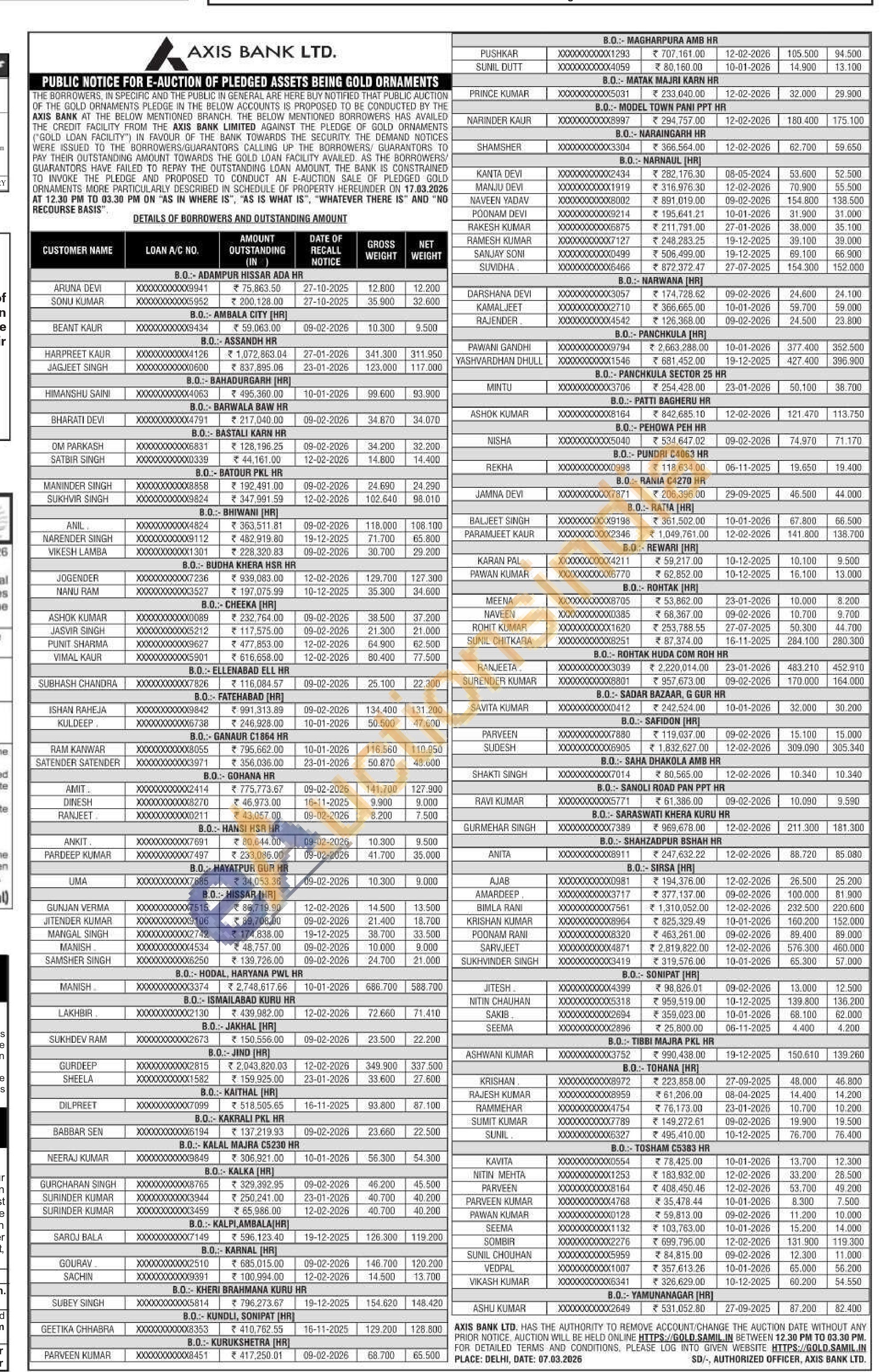 Axis Bank Gold Auctions Auction in Hisar
