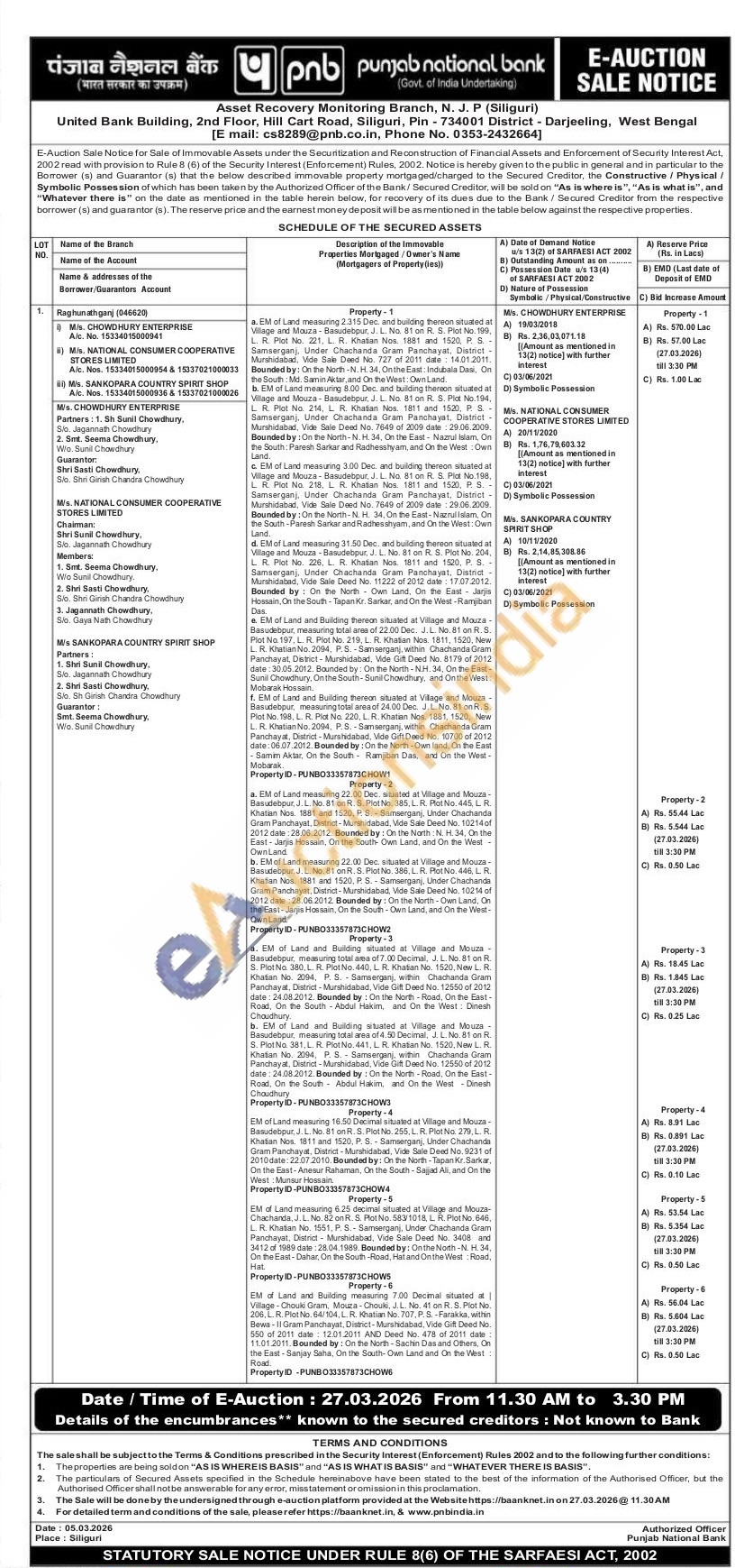 a. EM of Land and Building situated at Village and Mouza-Basudebpur, measuring total area of 7.00 Decimal, J. L. No. 81 on R. S. Plot No. 380, L. R. Plot No. 440, L. R. Khatian No. 1520, New L. R. Khatian No. 2094, P. S. Samserganj, within Chachanda Gram Panchayat, District-Murshidabad, Vide Gift Deed No. 12550 of 2012 date: 24.08.2012. Bounded by: On the North-Road, On the East-Road, On the South Abdul Hakim, and On the West: Dinesh Choudhury. b. EM of Land and Building situated at Village and Mouza Basudebpur, measuring total area of 4.50 Decimal, J. L. No. 81 on R S. Plot No. 381, L. R. Plot No. 441, L. R. Khatian No. 1520, New L. R. Khatian No. 2094, P. S. Samserganj, within Chachanda Gram Panchayat, District - Murshidabad, Vide Gift Deed No. 12550 of 2012 date: 24.08.2012. Bounded by: On the North-Road, On the East-Road, On the South Abdul Hakim, and On the West - Dinesh Choudhury
