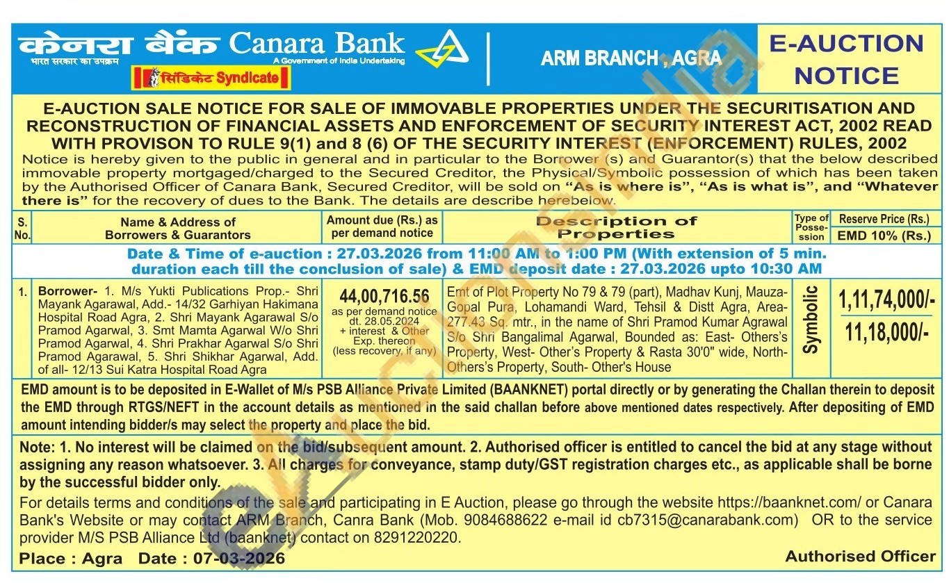 Emt of Plot Property No 79 & 79 (part), Madhav Kunj, Mauza-Gopal Pura, Lohamandi Ward, Tehsil & Distt Agra, Area-277.43 Sq. mtr., in the name of Shri Pramod Kumar Agrawal S/o Shri Bangalimal Agarwal, Bounded as: East- Others's Property, West- Other's Property & Rasta 30'0" wide, North-Others's Property, South- Other's House