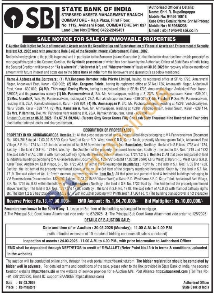 PROPERTY ID NO: SBINKANGAR003 Item No.1: All that piece and parcel of land & industrial buildings belonging to V A Panneerselvam (Document No. 1824/2015 dated 17.03.2015 SRO Karur West) at Karur R.D. West Karur S.R.D, Karur Taluk, presently Manmangalam Taluk, Andankovil East Village, S.F. No. 1724 Ac.1.29. In this, an extent of Ac. 0.864 within the following four Boundaries: North by: the land in S.F. Nos. 1733 and 1734, East by the land in S.F No. 1724/4, West by the 2nd item of the property mentioned hereunder, South by the land in S.F. Nos. 1719 and 1722 The said extent of Ac. 0.86 14 with mamool pathway rights etc. Present Sub-Division Nos. 1724/1,2 & 3. Item No 2: All that piece and parcel of land & industrial buildings belonging to V A Paneerselvam (Document No. 1824/2015 dated 17.03.2015 SRO Karur West) at Karur R.D. West Karur S.R.D. Karur Taluk, Andankovil East Village, S.F. No. 1725 Ac.1.19 within the following four Boundaries: North by the land in S.F. Nos. 1732 and 1733, East by: the 1st item of the property mentioned above, West by: the 3rd item of the property mentioned hereunder, South by the land in S.F. No. 1719. The said extent of Ac. 1.19 with mamool pathway rights etc. Item No 3: All that piece and parcel of land & industrial buildings belonging to VA Paneerselvam (Document No. 1824/2015 dated 17.03.2015 SRO Karur West) at Karur R.D. West Karur S.R.D, Karur Taluk, Andankovil East Village, S.F. No. 1726 Ac. 0.82 within the following four Boundaries: North by the land in S.F. No. 1732. East by the 2nd item of the property mentioned above, West by: The land in S.F. Nos. 1727 and 1718, South by the land in S.F. No. 1718, The said extent of Ac.0.82 with mamool pathway rights etc. The item 1,2 & 3 has total extent of Ac. 2.87 4 with industrial building with Plinth area 1,17,961 sq. ft. (The building plan approval is not available)