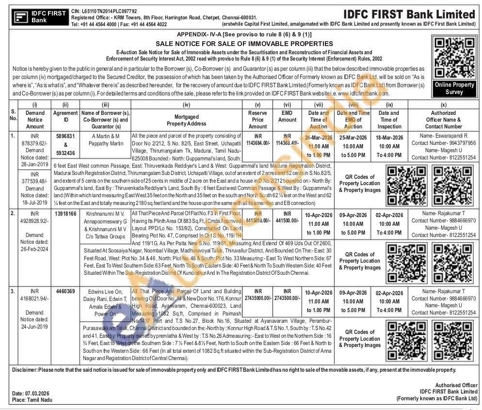 All the piece and parcel of the property consisting of Door No 2/212, S No. 82/5, East Street, Uchapatti Village, Thirumangalam Tk, Madurai, Tamil Nadu-625008 Bounded:- North: Guppammal'sland, South 6 feet East West common Passage, East: Thiruvenkada Reddiyar's Land & West: Guppammal's land Madurai Registration Distrid, Madurai South Registration District, Thirumangalam Sub District, Uchapatti Village, out of an extent of 2 acres and 82 cents in S.No.82/5, and extent of 5 cents on the southern side of 25 cents in middle of 2 acre on the East and a house in D. No 2/212 bounded on:- North By: Guppamma's land, East By: Thiruvenkada Reddiyar's Land, South By: 6 feet Eastwest Common Passage & West By: Guppamma's land (Within which land measuring East West 35 feet on the North and 35 feet on the south and North South 62% feet on the West and 62 feet on the East and totally measuring 2180 sq. feetland and the house upon the same with all its amenities and EB connection)