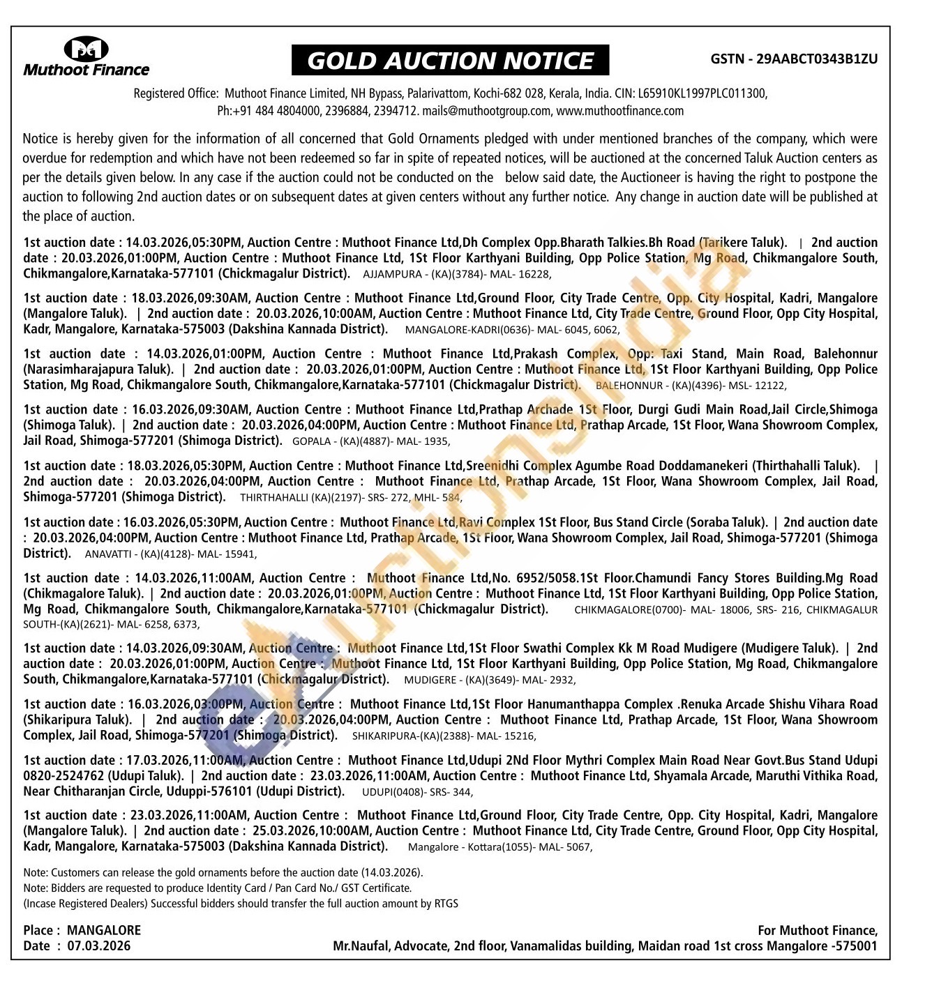 Muthoot Finance Ltd Gold Auctions Auction in Mangalore