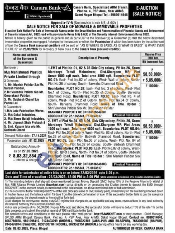 2) 2. EMT of Plot No.04, 05 & 06, Shiv City colony, PH No.26, Gram Mardanya Tehsil Maheshwar, Dist. Khargone MP. Plot Areas 1500 sqft each, Total area 4500 sqft. Boundaries: PLOT NO.04: East-Plot No. 05 of colony, West-Plot No. 03 of colony, North- Plot No.33 of colony, South Badwah Dhamnod Road, Boundaries: PLOT NO.05: East Plot No.06 of colony, West- Plot No. 04 of colony, North- Plot No.32 of colony, South Badwah Dhamnod Road, Boundaries: PLOT NO.06: East-Plot No.07 of colony, West-Plot No. 05 of colony, North-Plot No.31 of colony, South-Badwah Dhamnod Road, Name of Title Holder: Shri Manish Patidar S/o Mr.Suresh Patidar