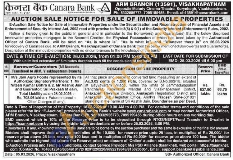 All that piece and parcel of converted land measuring an extent of Ac.3.02 cents or 1.200 Hcts, covered by S.No.663/18, situated at Bayyavaram Village, within the limits of Jammadulapalem Panchayat, Kasimkota Mandal and Visakhapatnam District, Anakapalli Revenue Division, Anakapalli Registration District and Anakapalli Sub Registrar Office, Andhra Pradesh State-531031 standing in the name of Sri Aashik Jain. Boundaries as per Deed.