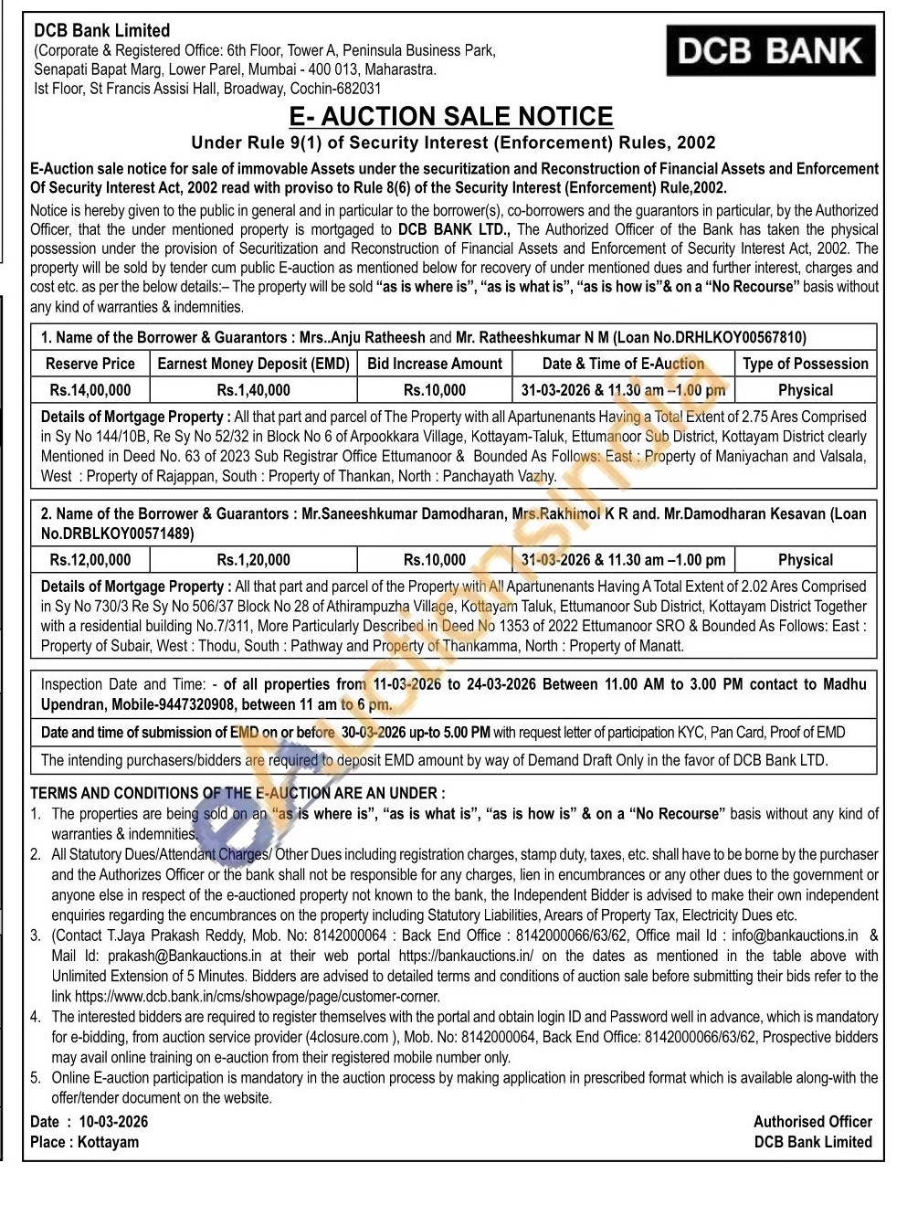 Details of Mortgage Property: All that part and parcel of the Property with All Apartunenants Having A Total Extent of 2.02 Ares Comprised in Sy No 730/3 Re Sy No 506/37 Block No 28 of Athirampuzha Village, Kottayam Taluk, Ettumanoor Sub District, Kottayam District Together with a residential building No.7/311, More Particularly Described in Deed No 1353 of 2022 Ettumanoor SRO & Bounded As Follows: East: Property of Subair, West: Thodu, South: Pathway and Property of Thankamma, North: Property of Manatt.