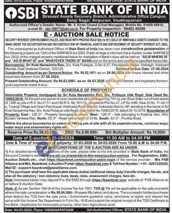 Mr. Y. Kiran Chand 91609 49910, e-mail ID: sbi.10077@sbi.co.in, 98482 49289