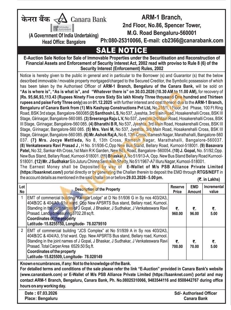 EMT of commercial building "JCS Complex" at No 51/939 A in Sy nos 403/2A3, 404B/2C & 404/A3, 51st ward. Opp. New APSRTS Bus stand, Bellary road, Kurnool. Standing in the joint names of J Gopal, J Bhaskar, J Sudhakar, J Venkateswara Ravi Prasad. Total Carper Area 6529.50 Sq.ft. Coordinates of the property