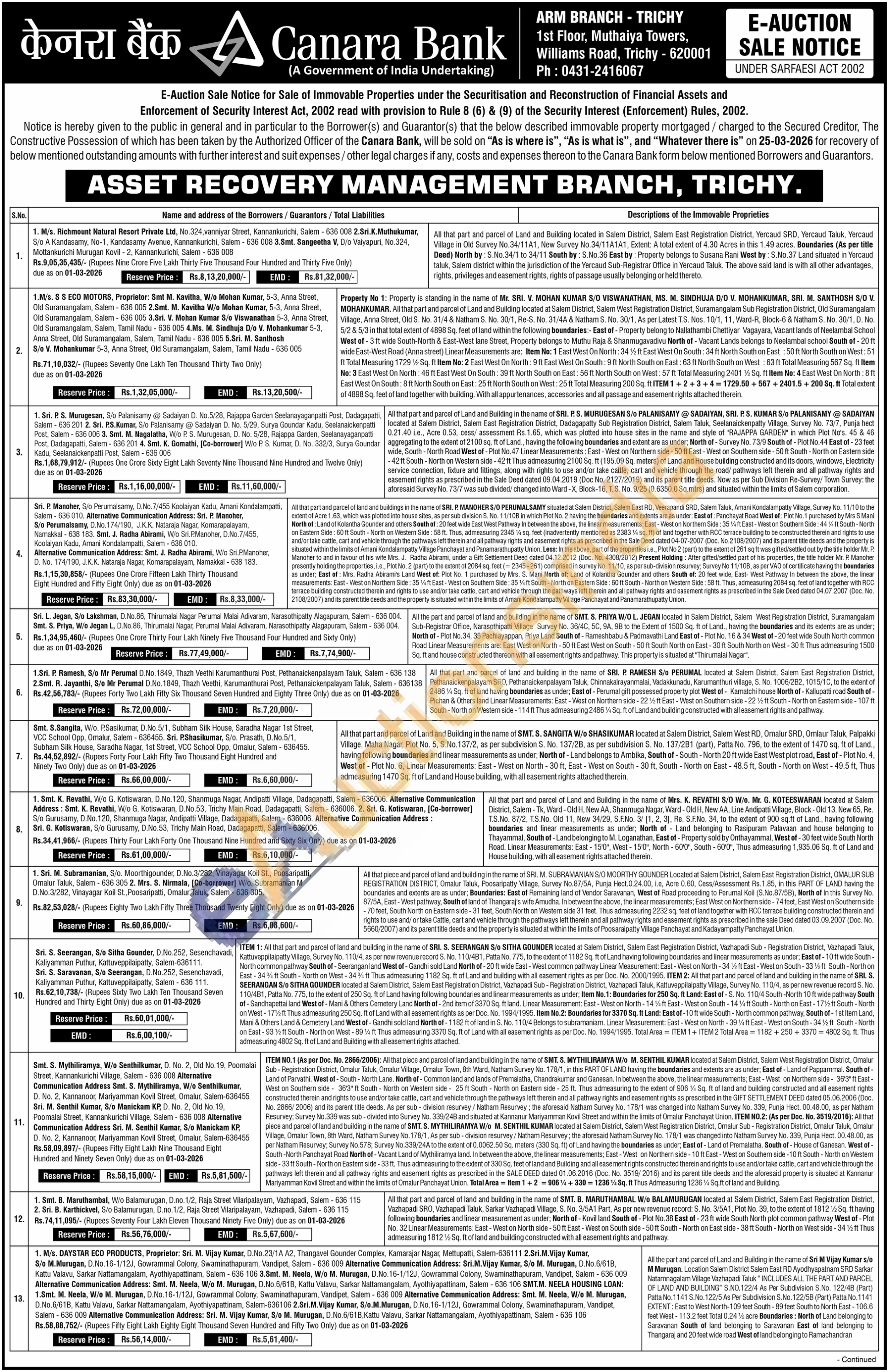 All that part and parcel of Land and Building located in Salem District, Salem East Registration District, Yercaud SRD, Yercaud Taluk, Yercaud Village in Old Survey No. 34/11A1, New Survey No.34/11A1A1, Extent: A total extent of 4.30 Acres in this 1.49 acres. Boundaries (As per title Deed) North by: 5.No.34/1 to 34/11 South by: S.No.36 East by: Property belongs to Susana Rani West by: S.No.37 Land situated in Yercaud taluk, Salem district within the jurisdiction of the Yercaud Sub-Registrar Office in Yercaud Taluk. The above said land is with all other advantages, rights, privileges and easement rights, rights of passage usually belonging or held thereto.