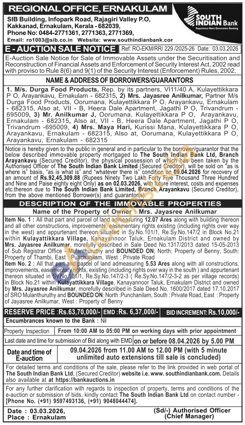 Item No. 1: All that part and parcel of land admeasuring 12.07 Ares along with building thereon and all other constructions, improvements, easementary rights existing (including rights over way in the west) and appurtenant thereon situated in Sy.No. 101/1, Re.Sy.No.147/2 in Block No.21 within Kulayattikkara Village, Kanayannoor Taluk, Ernakulam District and owned by Mrs. Jayasree Anilkumar, morefully described in Sale Deed No.1317/2013 dated 15-05-2013 of Sub Registrar Office Mulanthuruthy and BOUNDED ON; North: Property of Benny, South: Property of Thambi, East: Punchanilam, West Private Road Item No. 2: All that part and parcel of land admeasuring 5.53 Ares along with all constructions, improvements, easementary rights, existing (including rights over way in the south) and appurtenant thereon situated in Sy.No.101/1, Re.Sy.No.147/2-3 (Re.Sy. No. 147/2-3-2 as per village records) in Block No.21 within Kulayattikkara Village, Kanayannoor Taluk, Ernakulam District and owned by Mrs. Jayasree Anilkumar, morefully described in Sale Deed No. 1600/2017 dated 17.10.2017 of SRO Mulanthuruthy and BOUNDED ON: North Punchanilam, South: Private Road, East: Property of Jayasree Anilkumar, West: Property of Benny
