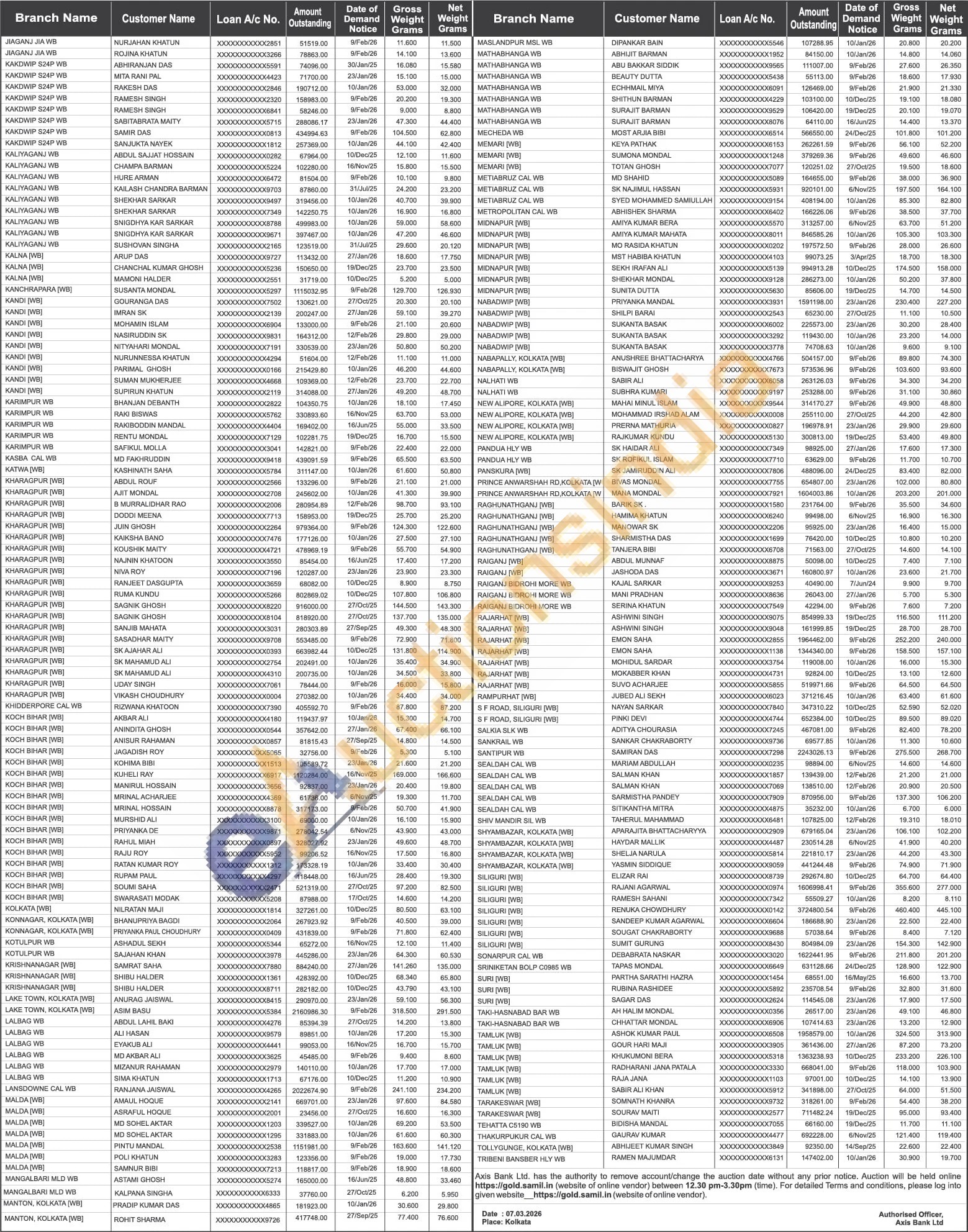 Axis Bank Gold Auctions Auction in Kolkata