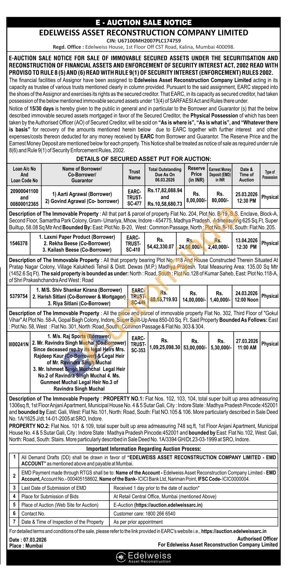Description of The Immovable Property: All the piece and parcel of immovable property Flat No. 302, Third Floor of "Gokul Vihar" At Plot No. 58-A, Gopal Bagh Colony, Indore. Super Built-Up Area 850-00 Sq. Ft. Said Property Bounded As Follows: East Plot No. 58, West Flat No. 301, North Road, South: Common Passage & Flat No. 303 & 304.