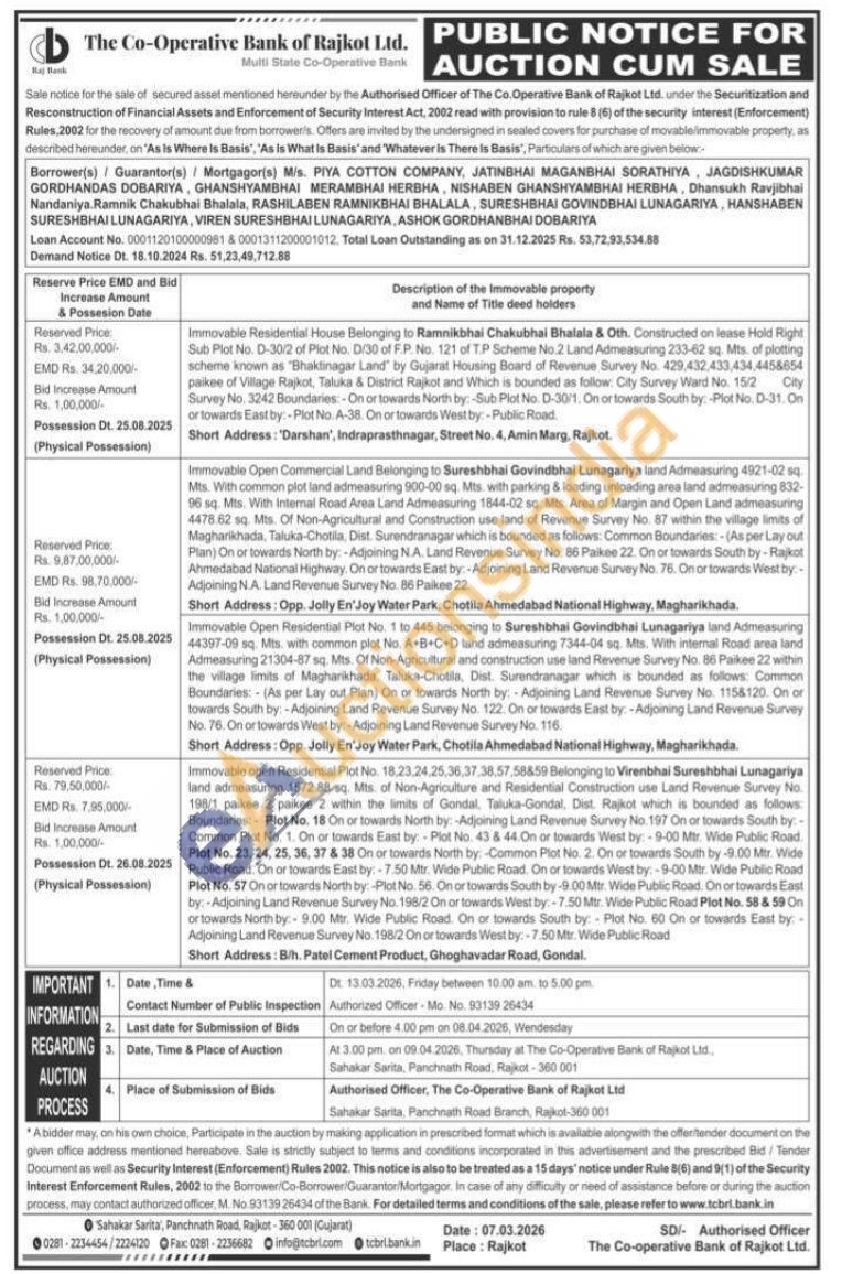 Immovable open Residential Plot No. 18.23.24.25.36.37.38.57.58859 Belonging to Virenbhai Sureshbhai Lunagariya land admeasuring 1572.88 sq. Mts. of Non-Agriculture and Residential Construction use Land Revenue Survey No. 198/1 paikee 2 pakee 2 within the limits of Gondal, Taluka-Gondal, Dist. Rajkot which is bounded as follows Boundaries: Plot No. 18 On or towards North by:-Adjoining Land Revenue Survey No. 197 On or towards South by-Common Plot No. 1. On or towards East by: Plot No. 43 & 44. On or towards West by:-9-00 Mtr. Wide Public Road Plot No. 23, 24, 25, 36, 37 & 38 On or towards North by: Common Plot No. 2. On or towards South by -9.00 Mtr. Wide Public Road. On or towards East by:-7.50 Mtr Wide Public Road. On or towards West by:-9-00 Mtr Wide Public Road Plot No. 57 On or towards North by: -Plot No. 56. On or towards South by-9.00 Mtr Wide Public Road. On or towards East by:-Adjoining Land Revenue Survey No. 198/2 On or towards West by:-7.50 Mtr. Wide Public Road Plot No. 58 & 59 On or towards North by:- 9.00 Mtr. Wide Public Road. On or towards South by: Plot No. 60 On or towards East by Adjoining Land Revenue Survey No 198/2 On or towards West by:-7.50 Mr. Wide Public Road Short Address: B/h. Patel Cement Product, Ghoghavadar Road, Gondal.