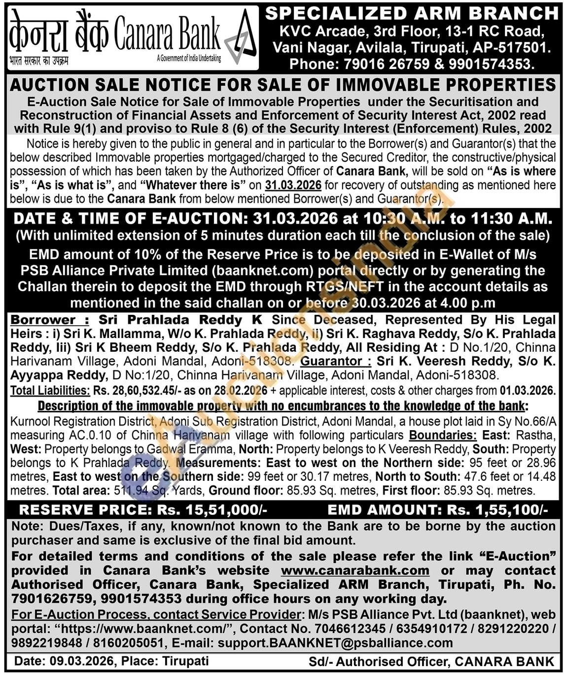 Description of the immovable property with no encumbrances to the knowledge of the bank:Kurnool Registration District, Adoni Registration District, Adoni Mandal, a house plot laid in Sy No.66/A measuring AC.0.10 of Chinna Harivanam village with following particulars Boundaries: East: Rastha, West: Property belongs to Gadwal Eramma, North: Property belongs to K Veeresh Reddy, South: Property belongs to K Prahlada Reddy. Measurements: East to west on the Northern side: 95 feet or 28.96 metres, East to west on the Southern side: 99 feet or 30.17 metres, North to South: 47.6 feet or 14.48 metres. Total area: 511.94 Sq. Yards, Ground floor: 85.93 Sq. metres, First floor: 85.93 Sq. metres