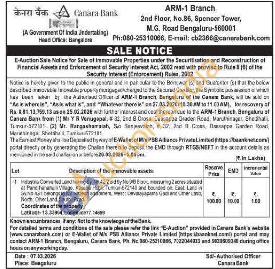Industrial Converted Land having Sy. No. 42/2 old Sy. No 9/B Block, measuring 2 acres situated at Pandithanahalli Vilage, Kasaba Hobli, Tumkur-572140 and bounded on: East: Land in Sy.No 42/1 belongs to KV Nagesh and others, West: Devarayapatna Gadi and Other Land, North: Other Land, South: Road.