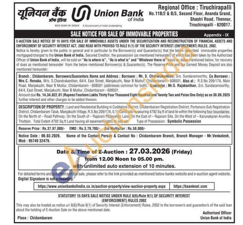 DESCRIPTION OF PROPERTY: Land and Residential Building in Cuddalore District, Chidambaram Registration District, Portonovo Sub Registration District, Chidambaram Taluk, Manjakuzhi Village, R.S.No.209/17A, 0.11 Cents site measuring 4792 Sq.ft of land lie within the following four boundaries On the North of-Road Pathway. On the South of Rajaram Padayatchi Land, On the East of Rajaram Site, On the West of-Karunakaran Arumbu Thottam. Total Extent 4792 Sq.ft Land having all easement rights of way etc. Type of Possession Symbolic Possession