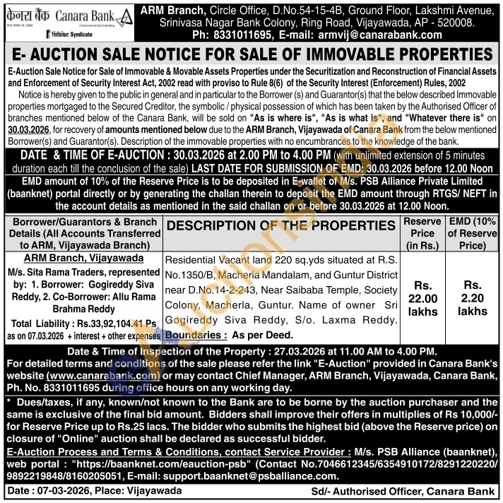 Residential Vacant land 220 sq.yds situated at R.S. No.1350/B, Macherla Mandalam, and Guntur District near D.No.14-2-243, Near Saibaba Temple, Society Colony, Macherla, Guntur. Name of owner Sri Gogireddy Siva Reddy, S/o. Laxma Reddy. Boundaries: As per Deed