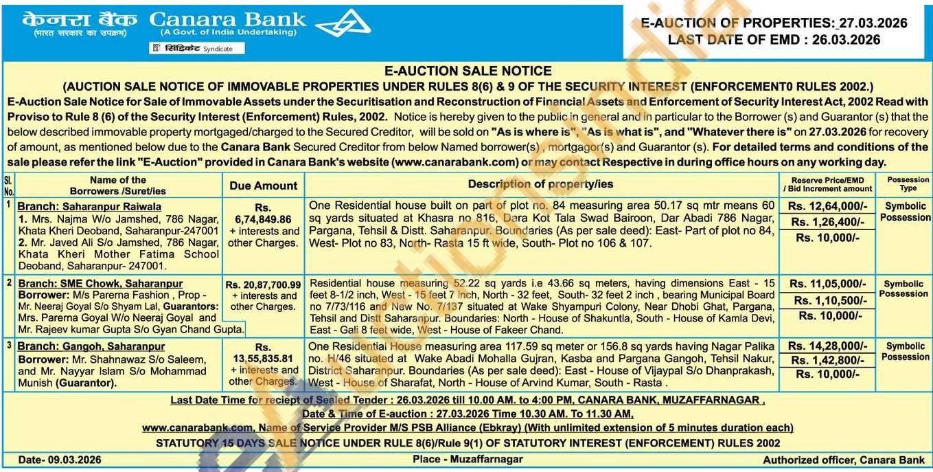 One Residential House measuring area 117.59 sq meter or 156.8 sq yards having Nagar Palika no. H/46 situated at Wake Abadi Mohalla Gujran, Kasba and Pargana Gangoh, Tehsil Nakur, District Saharanpur. Boundaries (As per sale deed): East - House of Vijaypal S/o Dhanprakash, West House of Sharafat, North House of Arvind Kumar, South - Rasta