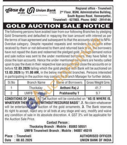 Union Bank of India Gold Auctions Auction in Tirunelveli