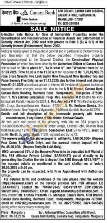 All that part and parcel of the property with site no 363 property id 151600603600520070 situated at Uddur Village, Kasaba Hobli, Hassan Taluk total measuring 1978.61 sq. Meters, bounded on: East: Sy no 74/2.5, West: Sy no 98, North: Sy no 76, South: 110 ft ring road and Sy no 72.
