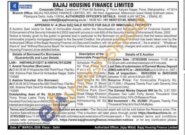 All That Piece and Parcel of The Immovable Property: Flat No 306 D/Right Side Khasra No 590 Third Floor D Block Plot No. 34,35-36.37 Krishna Park Devli Road Village Khanpur Delhi 110062 Area Admeasuring 66 Sq Yrds