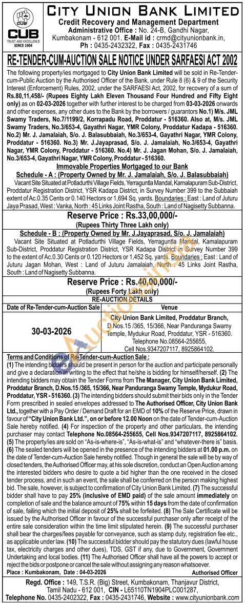Vacant Site Situated at Potladurthi Village Fields, Yerraguntia Mandal, Kamalapuram Sub-District, Proddatur Registration District, YSR Kadapa District in Survey Number 399 to the extent of Ac.0.30 Cents or 0.120 Hectors or 1,452 Sq. yards. Boundaries: East: Land of Juturu Jagan Mohan, West Land of Juturu Jamalaiah, North: 45 Links Joint Rastha, South: Land of Nagisetty Subbanna.