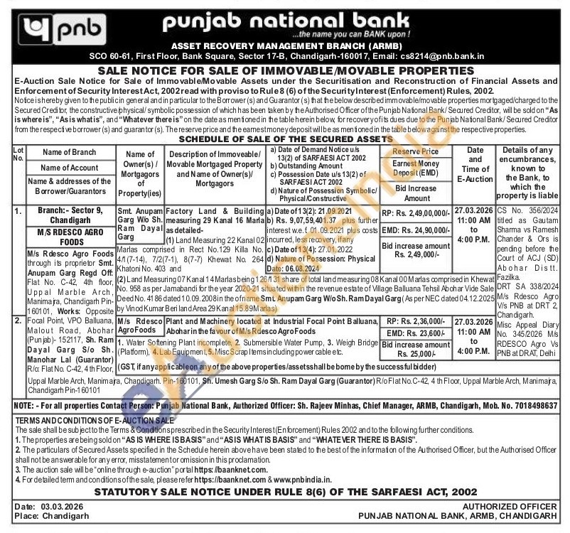 Authorized Officer: Sh. Rajeev Minhas, Chief Manager, ARMB, Chandigarh, Mob. No. 7018498637