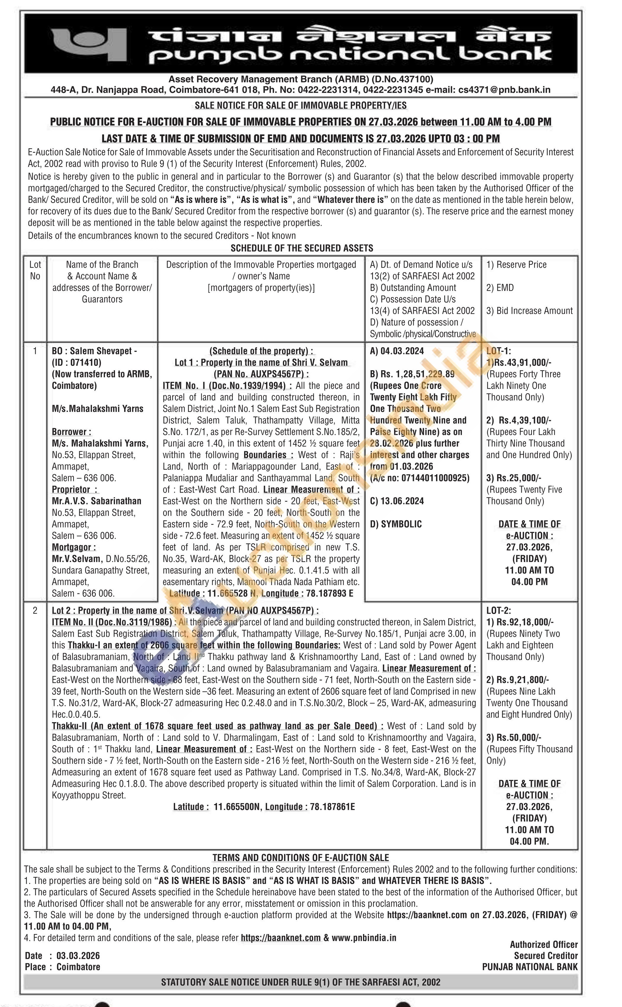ITEM No. I (Doc.No.1939/1994): All the piece and parcel of land and building constructed thereon, in Salem District, Joint No.1 Salem East Sub Registration District, Salem Taluk, Thathampatty Village, Mitta S.No. 172/1, as per Re-Survey Settlement S.No. 185/2, Punjai acre 1.40, in this extent of 1452 1½ square feet within the following Boundaries: West of Raji's Land, North of Mariappagounder Land, East of Palaniappa Mudaliar and Santhayammal Land, South of East-West Cart Road. Linear Measurement of: East-West on the Northern side 20 feet, East-West on the Southern side 20 feet, North-South on the Eastern side-72.9 feet, North-South on the Western side-72.6 feet. Measuring an extent of 1452 15 square feet of land. As per TSLR comprised in new TS. No.35, Ward-AK, Block-27 as per TSLR the property measuring an extent of Punjai Hec. 0.1.41.5 with all sasementary rights. Mamool Thada Nada Pathiam etc. Latitude: 11.665528 N, Longitude: 78.187893 E