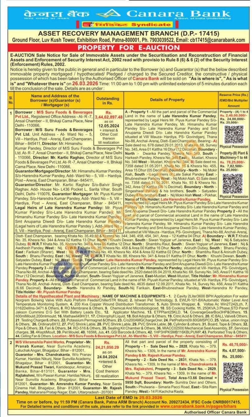 All the part and parcel of the Commercial represented by Legal Heirs Mr. Piyus Kumar Pandey S/o-Late Harendra Kumar Pandey, Mr. Himanshu Kumar Pandey S/o- Late Harendra Kumar Pandey and Smt Anupama Diwedi Dio- Late Harendra Kumar Pandey situated at Vill/ Mauza- Hardiya, PS- Govindganj. Thana No-88, Anchal-Areraj. Distt-East Champaran, Bearing:-A) No. 345, Area 01 Kattha 16 Dhur (12 Decimal). Boundary -North Dwarika Pandey, Khesra No- 349, South Harkesh Pandey, Khesra No. 345 East: Mustari, Khesra No. 346 West:- Mustan, Khesra No. 344, B) Sale deed no. 7358 dated 31.05.2011, Khata No. 16 & Khesra No. 455, Alah, South: Legal Heirs of Late Sakal Pandey East -Bhubneshwar Pandey West:- Nij Mokir Alah, C) Sale deed no. 7358 dated 31.05.2011, Khata No. 93 & Khesra No. 342, Area 01 Kattha (06% Decimal). Boundary - North-Singeshwar Pandey & his brothers, South Satyadev No. 35, Khesra No. 344 & Area 02 Kattha 13 Dhur. North: Khushi Dewan, South: Siwan Yogiyar urf Janerwa, East: Nij, West: Nij & Satyadev Dubey. B) W.R.T Khata No. 35, Khesra No. 346 & Area 05 Kattha 12 Dhur. North: Shambhu Raut, South: Siwan Yogiyar urf Janerwa, East: Nij & Awdhesh Pandey, West: Nij. C) W.R.T Khata No. 35, Khesra No. 458 & Area 00 Kattha 16 Dhur. North: Anirudh Dubey, South: Bhanu Pandey, East: Farikain (Sharer), West: Nij. D) W.R.T Khata No. 49, Khesra No. 454 & Area 02 Kattha 02 Dhur. North: Shambhu Raut & Anirudh Dubey, South: Bhanu Pandey, East: Nij, West: Nij. E) W.R.T Khata No. 88, Khesra No. 341 & Area 01 Kattha 01 Dhur, North: Khushi Dewan, South: Satyadev Dubey, East: Nij. West: Sadak, Title Holder: Late Harendra Kumar Pandey, represented by Legal Heirs Mr. Piyus Kumar Pandey Slo-Late Harendra Kumar Pandey, Mr. Himanshu Kumar Pandey S/o-Late Harendra Kumar Pandey and Smt Anupama Diwedi Dio-Late Harendra Kumar Pandey Property 3-All the part and Parcel of Commercial Land in the name of Mr. Himanshu Kr Pandey, situated at Vill-Hardiya, PS- Govindganj, Thana No-88, Anchal-Areraj. Distt-East Champaran, bearing Sale deed No. 2520 dated 05.04.2019, Khata No. 68, Survey No. 345, Area 01 Kattha 16 Dhur (12 Decimal), Boundary-North-Mustari, South-Siwan Yogiyar urf Janerwa, East-Mustari, West-Mustari, Title Holder: Mr. Himanshu Kumar Pandey. Property 4-All the part and Parcel of Commercial Land in the name of Mr. Piyush Kumar Pandey, situated at Vill-Hardiya, PS-Govindganj, Thana No-88, Anchal-Areraj, Distt-East Champaran, bearing Sale deed No. 4635 dated 12.09.2011, Khata No. 14, Survey No. 456, Area 01 Kattha (6.66 Decimal), Boundary North- Harendra Kr Pandey, South-Nij Farikain, East-Bhubneshwar Pandey, West-Harendra Kr Pandey, Name of Title Holder: Late Harendra Kumar Pandey, represented by Legal Heirs Mr. Piyus Kumar Pandey S/o-Late Harendra Kumar Pandey, Mr. Himanshu Kumar Pandey S/o-Late Harendra Kumar Pandey and Smt Anupama Diwedi Dio- Late Harendra Kumar Pandey Property 2-All the part and parcel of Commercial ancestral Land in the name of Late Harendra Kumar Pandey, represented by Legal Heirs Mr. Piyus Kumar Pandey S/o-Late Harendra Kumar Pandey, Mr. Himanshu Kumar Pandey S/o- Late Harendra Kumar Pandey and Smt Anupama Diwedi Dio-Late Harendra Kumar Pandey, situated at Vill/Mauza-Hardiya, PS-Govindganj, Thana No-88, Anchal-Areraj, 344, 346, 458, 454, 341, Area-12 Kattha 04 Dhur. A) Boundary W.R.T Khata