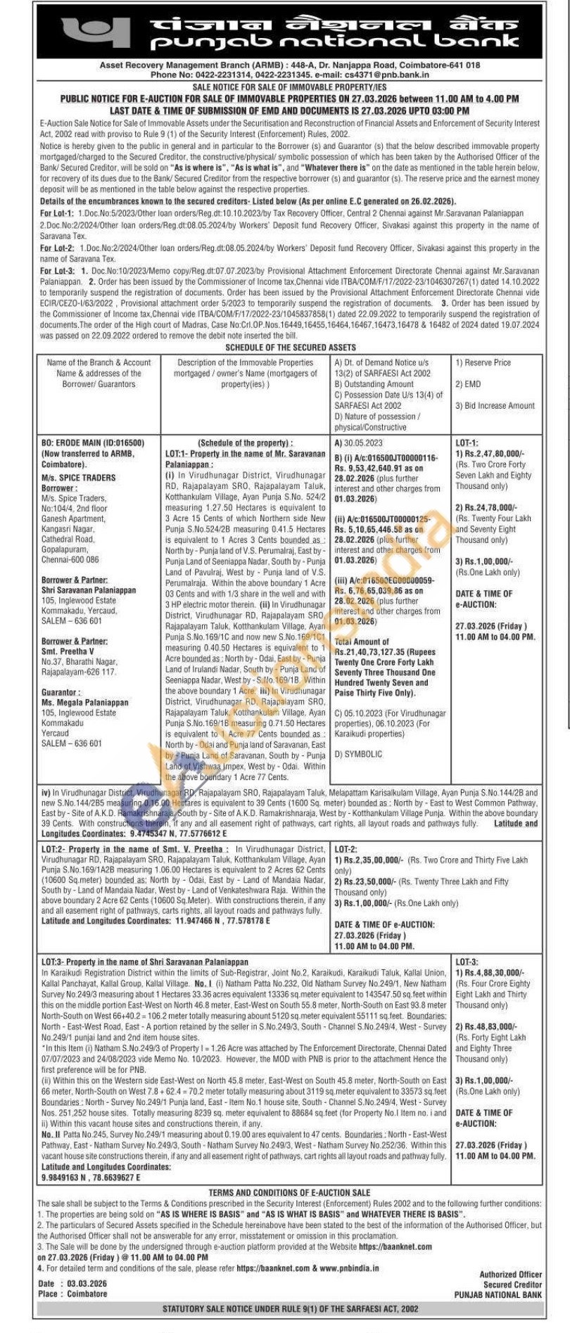 "In this Item (i) Natham S.No.249/3 of Property 1 = 1.26 Acre was attached by The Enforcement Directorate, Chennai Dated 07/07/2023 and 24/08/2023 vide Memo No. 10/2023. However, the MOD with PNB is prior to the attachment Hence the first preference will be for PNB.