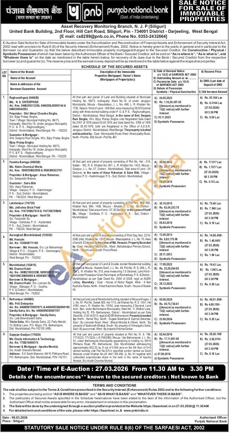 All that part and parcel of Land and Building situated at Municipal Holding No 68/73, Indirapally, Ward No. 19, of under Jangipur Muniopality, Mouza Basudebpur, J. L. No. 468. L. R. Khatari No 1720. Nature/Kind of Land-Vet/Blars, ansa measuring 06:00 Decimal along with three stoned bulding under P. O&PS. Raghunathgary, Distri-Murshidabad West Bengal, in the name of Smt. Swapna Rani Singha. Wo Bijoy Pratap Singha vide Registered Sale Deed No 3767 of 1976 dated 03.05.1976 and Sale Deed No. 378 of 1976 daled 01.05.1970. both are Registered in the Office of ADSR Jangipur District-Murshidabad, West Bengal. The property is butted and bounded by: East-Municipally Road West-Municipality Road North Plot No 408 South Plotis 467