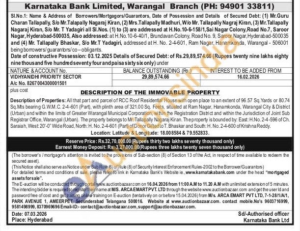 Description of Properties: All that part and parcel of RCC Roof Residential House with open place to an extent of 96.57 Sq. Yards or 80.74 Sq.Mts bearing G.W.M.C. 2-4-601 (Part), with plinth area of 321.00 Sq. Feets, situated at Ram Nagar, Hanamkonda, Warangal City & District (Urban) and within the limits of Greater Warangal Municipal Corporation, within the Registration District and within the Jurisdiction of Joint Sub Registrar Office, Warangal (Urban). The property belongs to Mr. Tallapally Nagaraj Kiran. The property is bounded by: East: H.No. 2-4-596 of Ch. Saraiah, West 20-0" Wide Road, North: H. No. 2-4-601 (Part) of Donor Gifted to T. Bhaskar and South: H. No. 2-4-600 of Krishna Reddy.