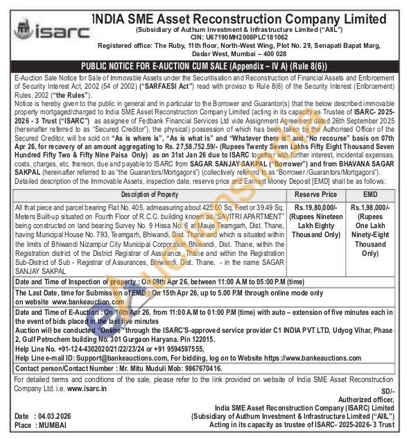 All that piece and parcel bearing Flat No. 405, admeasuring about 425.00 Sq. Feet or 39.49 Sq. Meters Built-up situated on Fourth Floor of R.C.C. building known as "SAVITRI APARTMENT" being constructed on land bearing Survey No. 9 Hissa No. 6 at Mauje Teamgarh, Dist. Thane, having Municipal House No. 793, Teamgarh, Bhiwandi, Dist. Thane and which is situated within the limits of Bhiwandi Nizampur City Municipal Corporation Bhiwandi, Dist. Thane, within the Registration district of the District Registrar of Assurance, Thane and within the Registration Sub-District of Sub-Registrar of Assurances, Bhiwandi, Dist. Thane. in the name SAGAR SANJAY SAKPAL